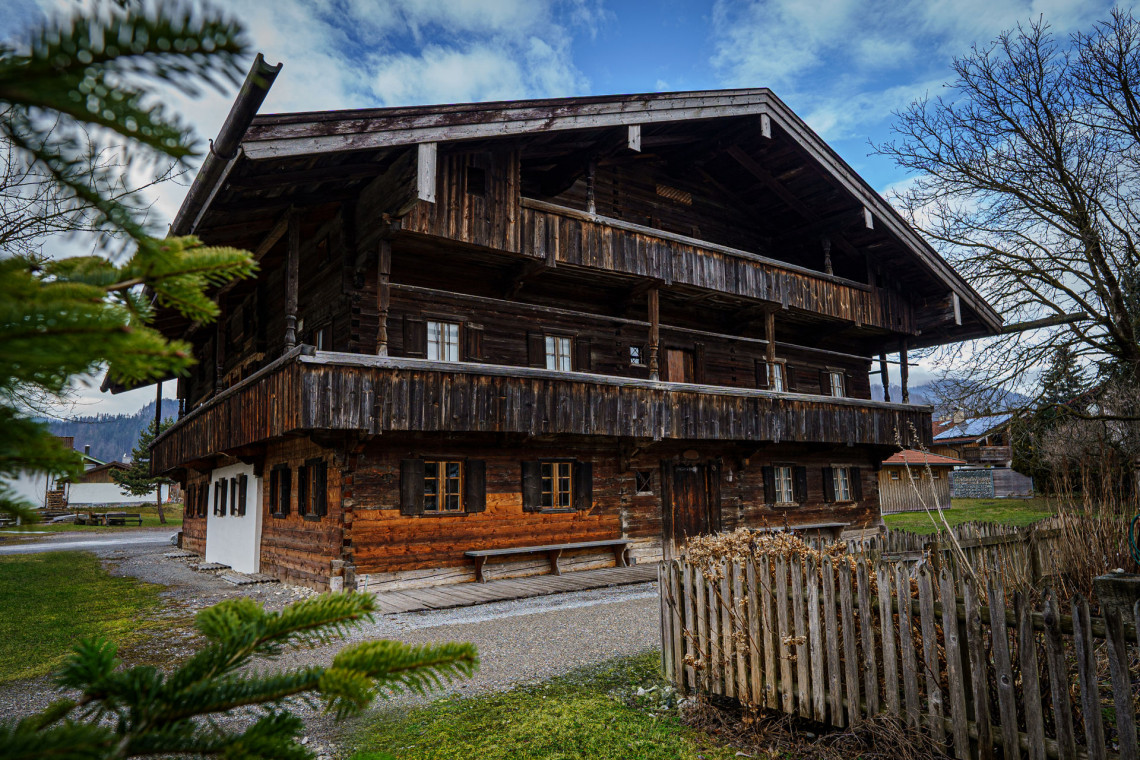 • Historische Uhr am Gibel des Blaahauses vor verschneiter Bergkulisse Kiefersfeldens