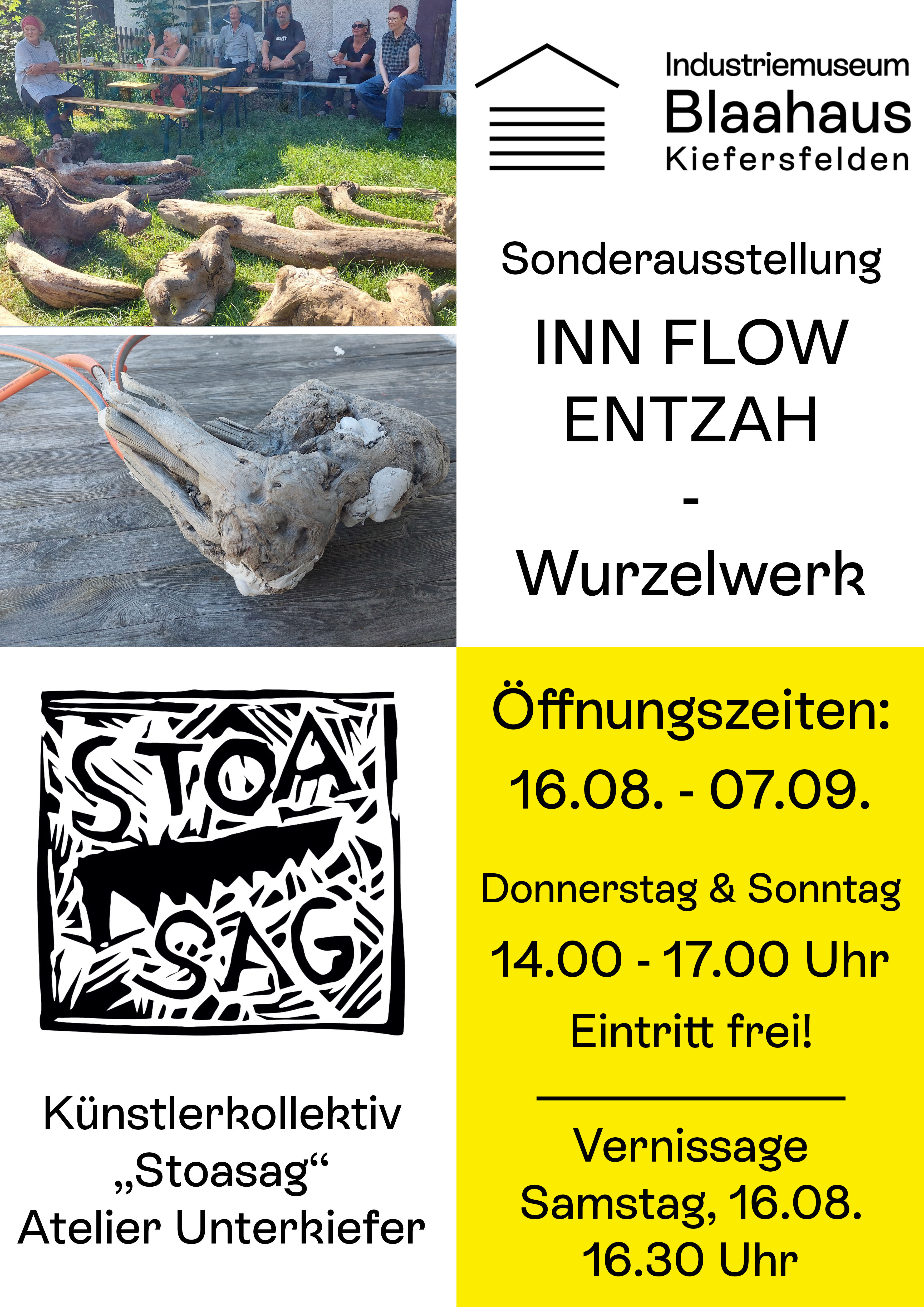 Ab dem 16. August steht das Blaahaus ganz im Zeichen der Natur und des Wandels: Das Künstlerkollektiv "Stoasag"aus dem Atelier Unterkiefer präsentiert in einer neuen Sonderausstellung unter dem Titel „INN FLOW ENTZAH – Wurzelwerk“ beeindruckende Arbeiten aus Schwemmholz und Wurzelwerk.
